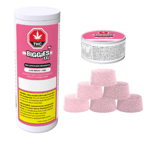 Premium, rapid onset, live resin, high-quality BIGGIES. This multi-pack of six single gummies feature, THE BIG ONE’S, which are 8g oversized gummies with a total of 10mg THC (live resin), 20mg CBD per individual gummy equaling a total of 60mg of THC, 120mg CBD per master container utilizing our Ice Cream Cake x Gelato #33 strain. This flavour profile features sun-ripened lemons with sweet, juicy notes of pink berries, all swirled together with a silky smooth cream. This vibrant medley provides a velvety cream finish, offering a refreshing yet indulgently smooth experience. Our gummies are manufactured in-house using cannabis ingredients from British Columbia and are made with all-natural ingredients. Vegan, gluten-free, sulphite-free, and cannabis-terpene enhanced.